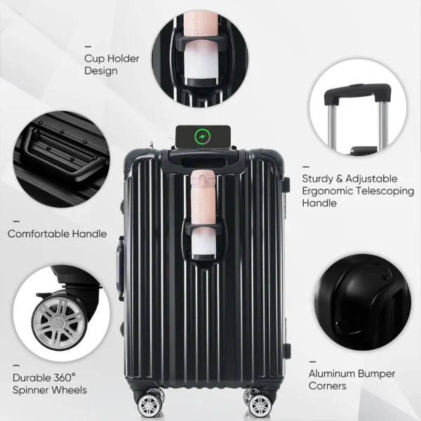 HomeLuggage & Travel Bags 1pc 24in Aluminum Frame Luggage with USB port, Vacation Carry-On Suitcase with Spinner Wheels and TSA Lock, Travel Trolley Case For Short Business Trips, Beach Holidays, black