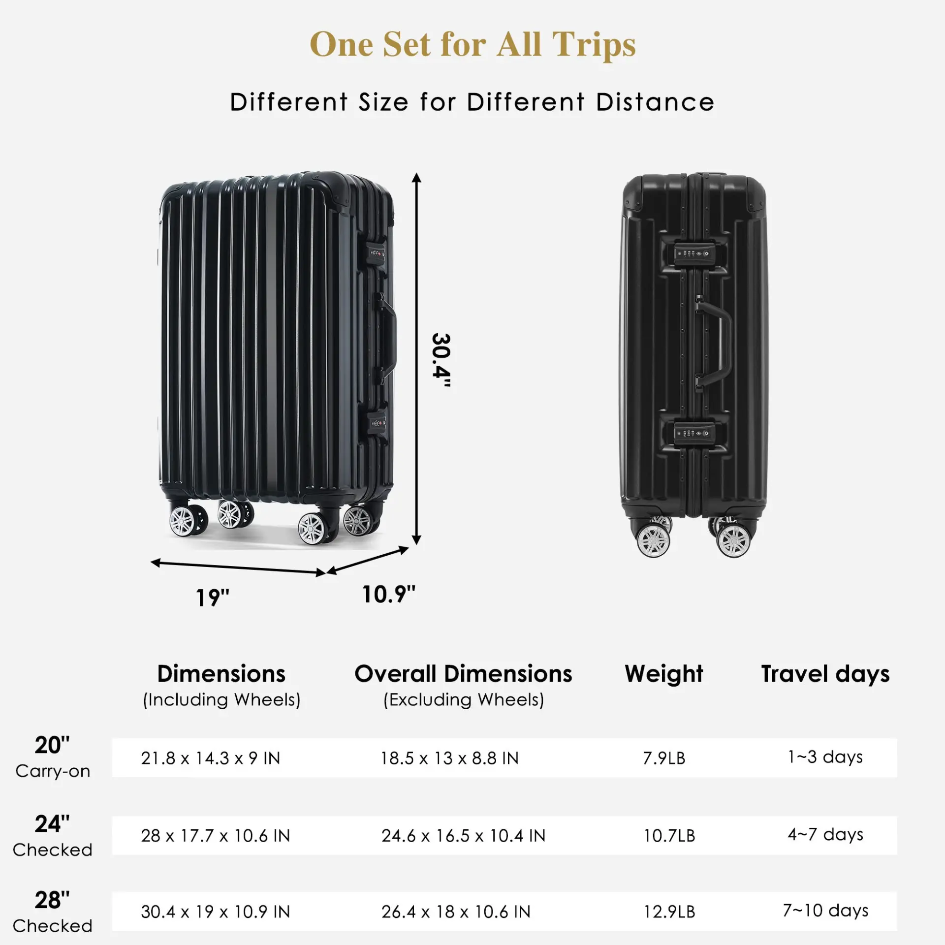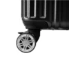 Wheel design allowing for 360-degree rotation for the light effortless maneuvering; Multi-stage push button locking handle to adjust comfortably to any size traveler.