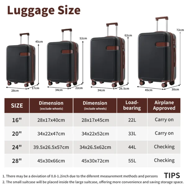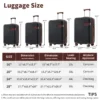 - [Luggage Size-included accessories]: 16 IN luggage dimensions:11’x6.7’x17.7′; 20 IN luggage dimensions: 13.2’x8.7’x20.4′;24 IN luggage dimensions:15.6’x10.4’x24.4′;28 IN luggage dimensions:17.7’x11.6’x28.3′.