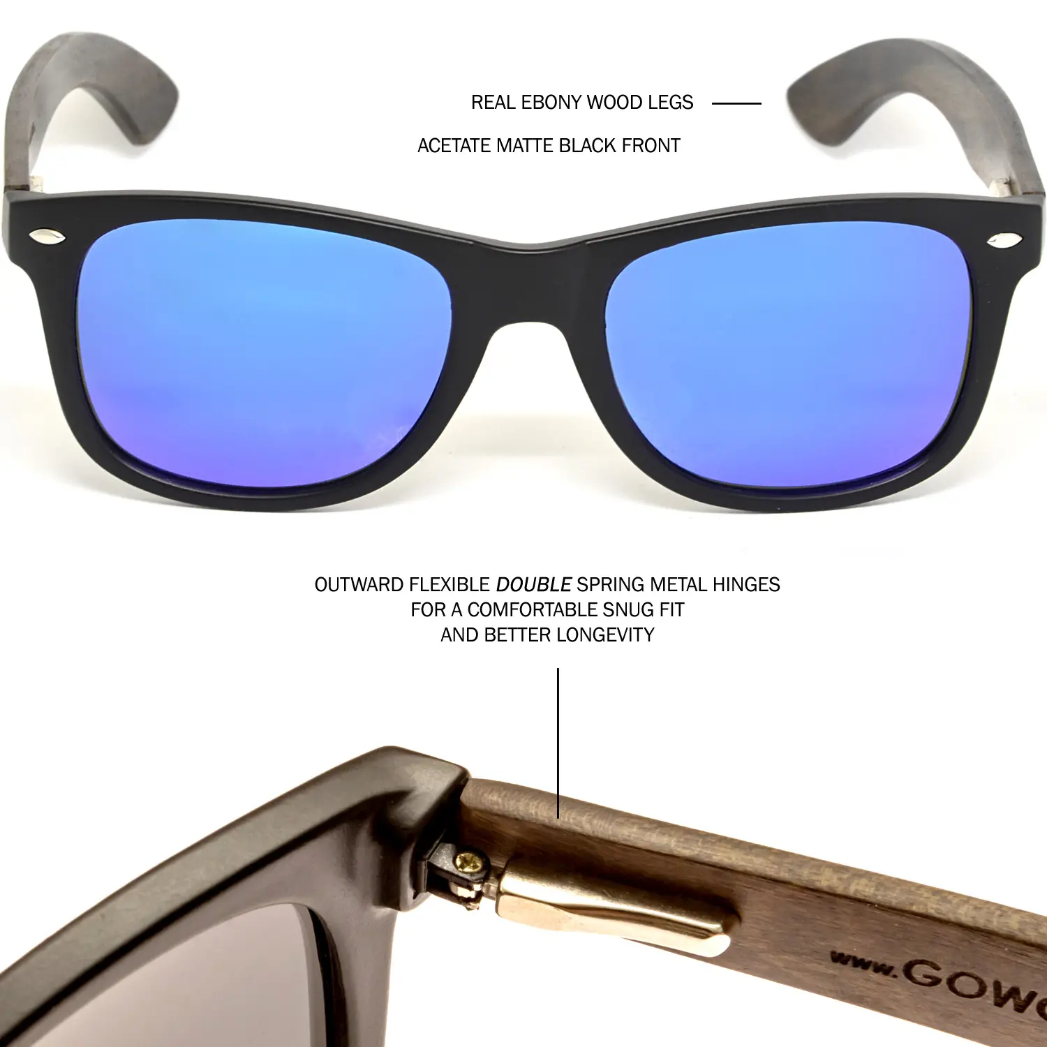 Ebony wood classic style sunglasses with matte black acetate front frame and blue mirrored polarized lenses