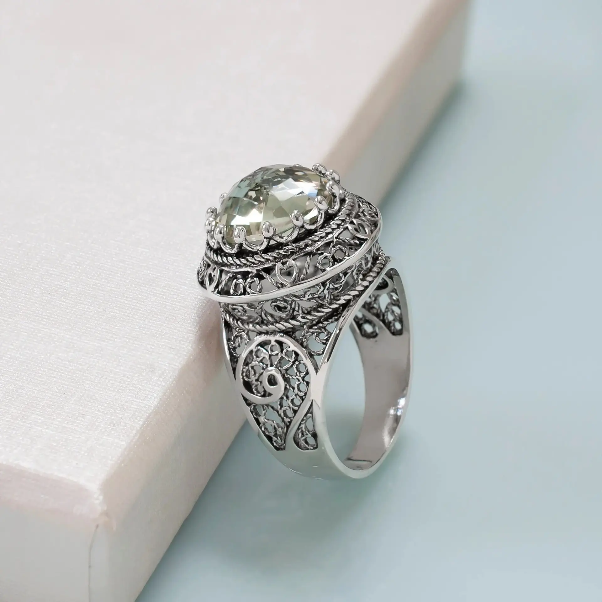 Cherish this handcrafted filigree statement ring with dazzling Prasiolite gemstone. A true work of wearable art.