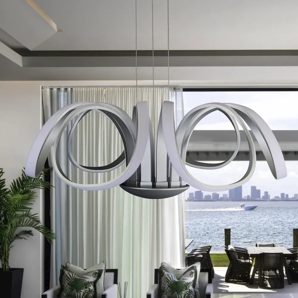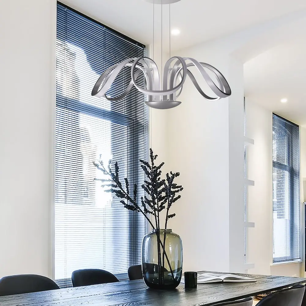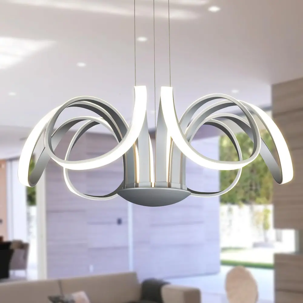 LED: Integrated LED fixture UNIQUE DESIGN: Modern Flower-shaped Integrated LED chandelier with Aluminum 6 flowing petals in Satin Silver Finish LIGHT DIRECTION: Ambient ADJUSTABLE: Height adjustable cables through cable locking pins, from 122 inches total height to 33.75 inches, with each cable being adjusted individually DIMMABLE: Dimmable LED (15% – 100%) with ELV – Electric Low Voltage Dimmers (Dimmer is not included with the fixture) ONLY compatible with ELV dimmers. Wi-Fi, Smart, and Universal dimmers are NOT compatible SOFT WHITE: 3000 Kelvin color temperature BRIGHTNESS: 5254.26 delivered lumens EFFICIENCY: 75 watts total consumption CRI 90: is the highest measurement of light in relation to accuracy of color appearance DRY LOCATION APPROVED: ETL listed for dry locations VOLTAGE: Operates on standard 120 line voltage Installer Tip: DO NOT CUT WIRES attached to the fixture under any circumstance. Excess cable should be neatly looped and tucked into the canopy ETL Certified, cETL Certified, Title 20 Compliant, Title 24 Compliant, Prop 65 Compliant, Energy Star Compliant Slanted/ Sloped Ceiling Compatible