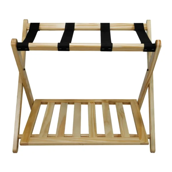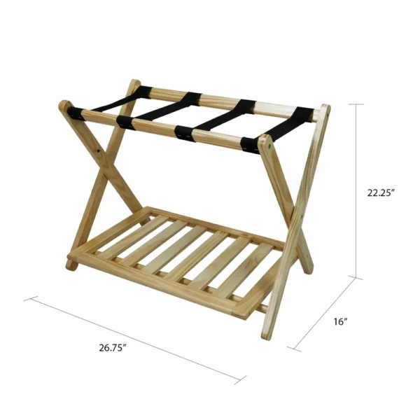 Our luggage rack constructed with solid wood in warm Walnut finish with black straps. Sturdy construction supports up to 150 pounds on top shelf and 50 pounds for lower shelf. The convenient lower shelf provides extra space to store items
