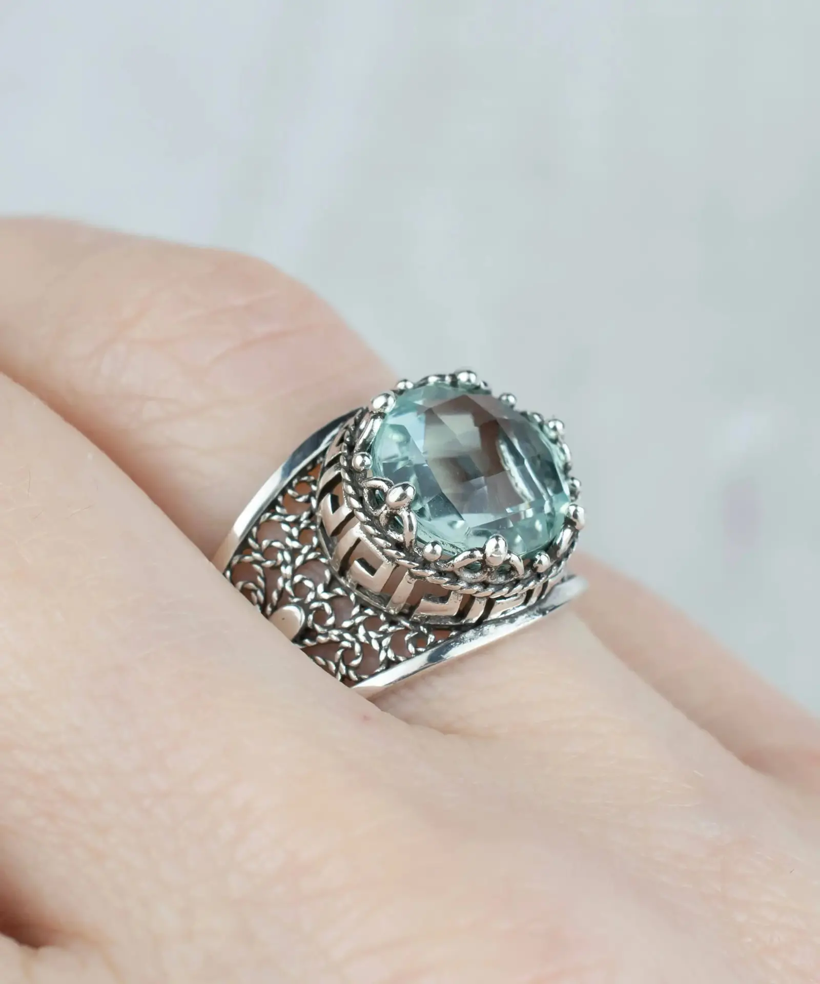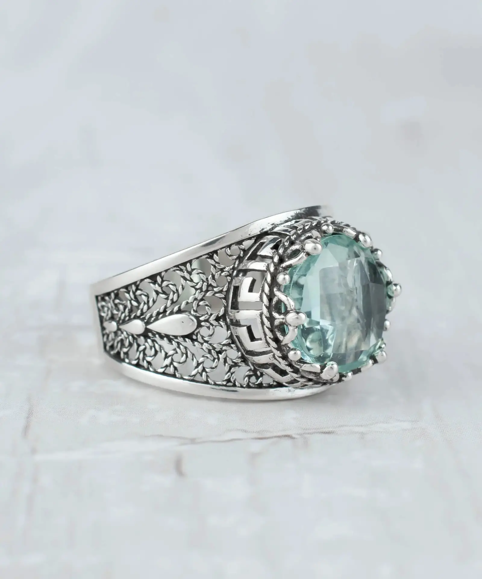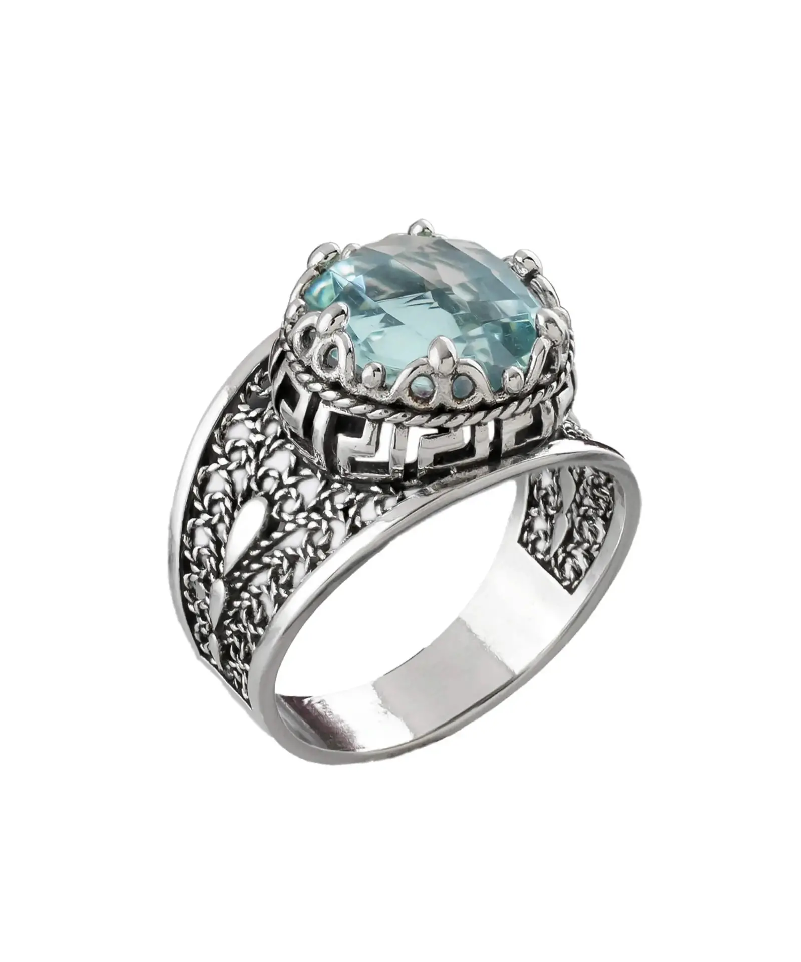 Meander Pattern Filigree Art Aquamarine Gemstone Women Silver Cocktail Ring