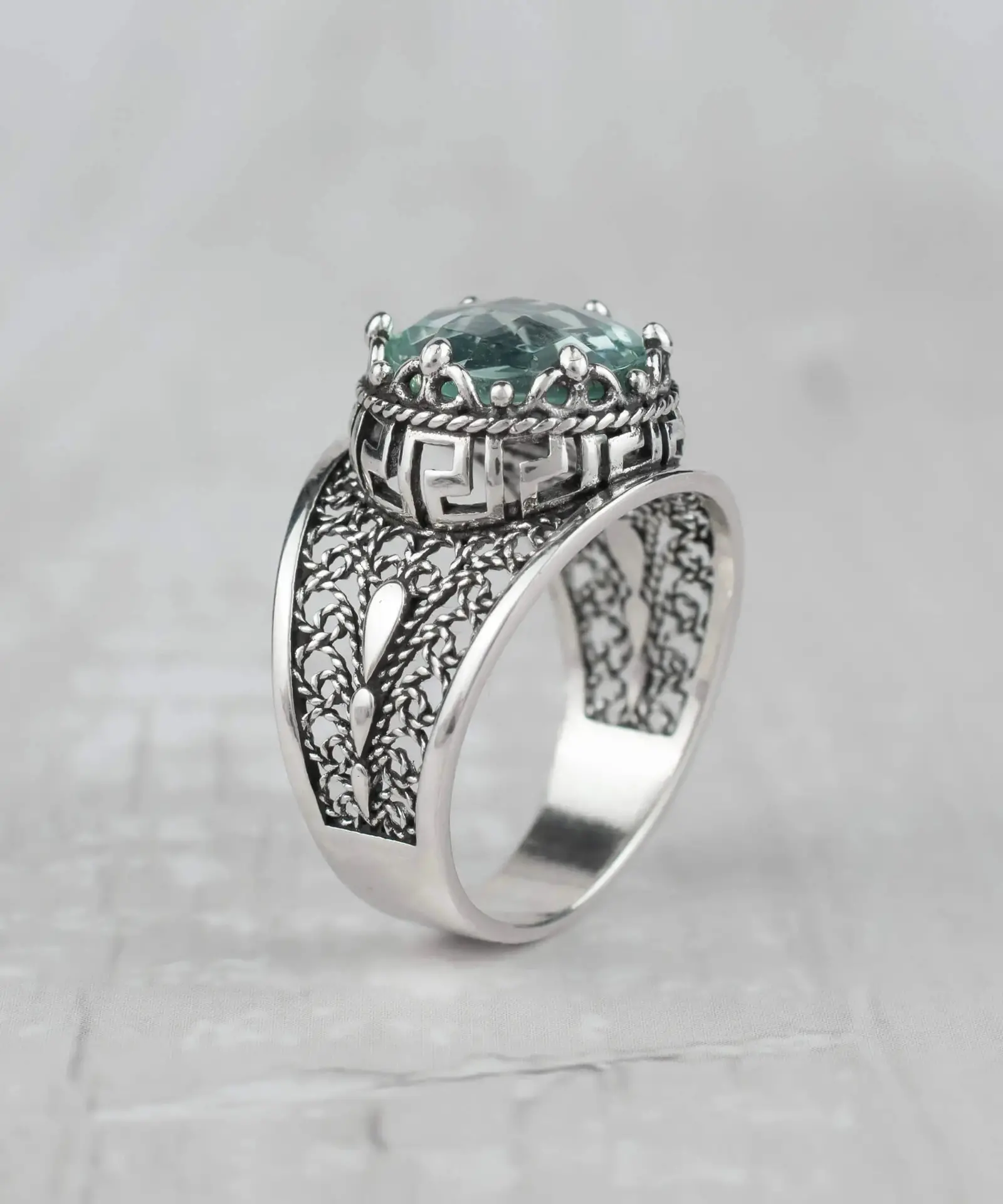 Be the first to review “Meander Pattern Filigree Art Aquamarine Gemstone Women Silver Cocktail Ring”