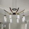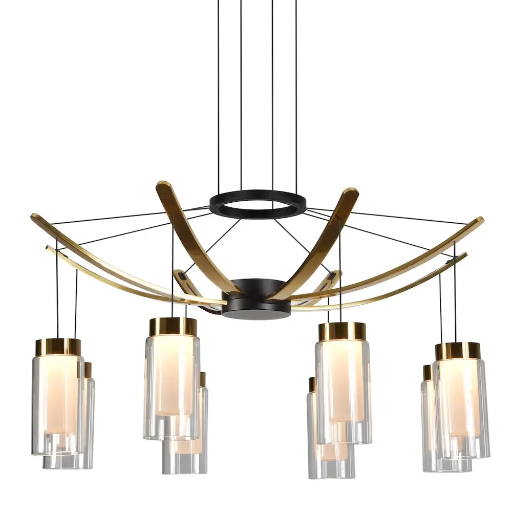 LED: Integrated LED fixture DESIGN: Modern Chandelier with 8 Cone Shaped Glass Shades with Antique Brass element. The Glass Shades are clear outside and frosted inside LIGHT DIRECTION: Ambient ADJUSTABLE: Height adjustable cables through cable locking pins, from 120 inches total height to 15.75 inches, with each cable being adjusted individually DIMMABLE: Dimmable LED (15% – 100%) with ELV – Electric Low Voltage dimmers (Dimmer is not included with the fixture) ONLY compatible with ELV dimmers. Wi-Fi, Smart, and Universal dimmers are NOT compatible SOFT WHITE: 3000 Kelvin color temperature BRIGHTNESS: 2410.20 delivered Lumens EFFICIENCY: 39.13 Watts low power consumption CRI 90: is the highest measurement of light in relation to accuracy of color appearance DRY LOCATION APPROVED: ETL listed for dry locations VOLTAGE: Operates on standard 120 line voltage ETL Certified, cETL Certified, Title 20 Compliant, Title 24 Compliant, Prop 65 Compliant, Energy Star Compliant Installer Tip: DO NOT CUT WIRES attached to the fixture under any circumstance. Excess cable should be neatly looped and tucked into the canopy Slanted/ Sloped Ceiling Compatible