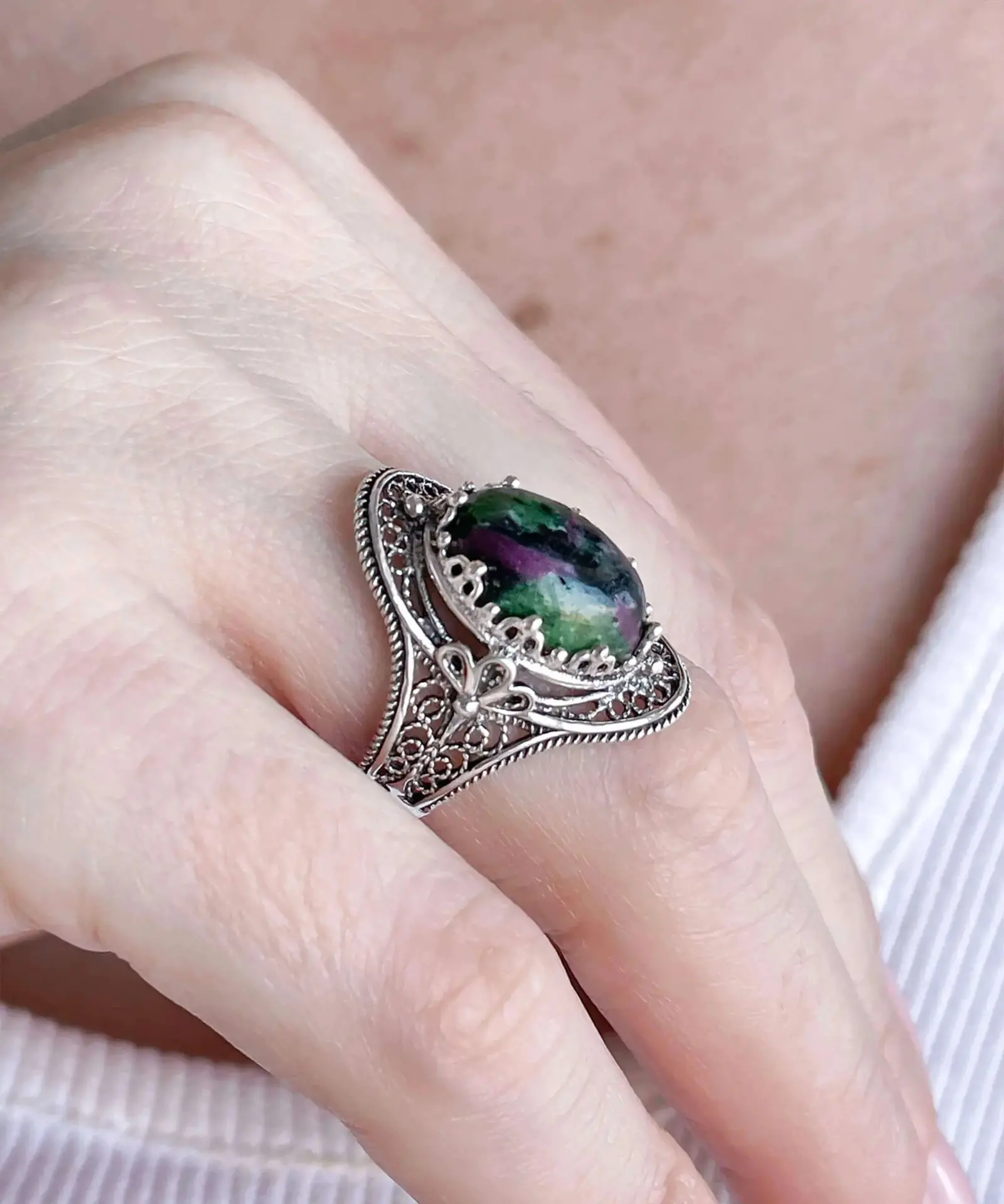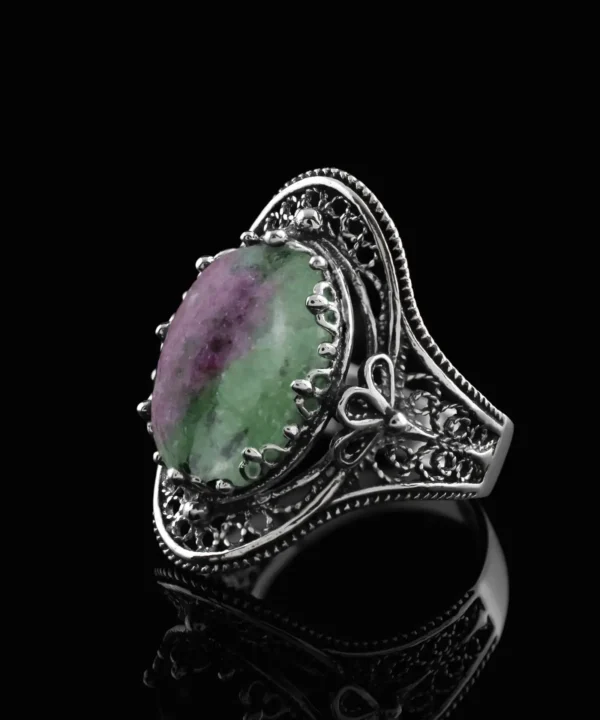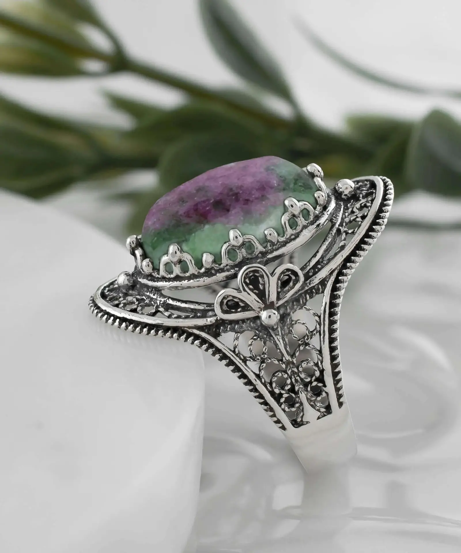 This stunning ring is perfect for any occasion and comes with a gift box, velvet pouch, silver polish cloth, and care card to keep it sparkling. The 10×14 mm oval cut Ruby Zoisite gemstone is cabochon, reflecting light multiple times in every direction. It is expertly handcrafted by our team of Artisans and Craftsmen, making it a unique and unforgettable piece of jewelry.