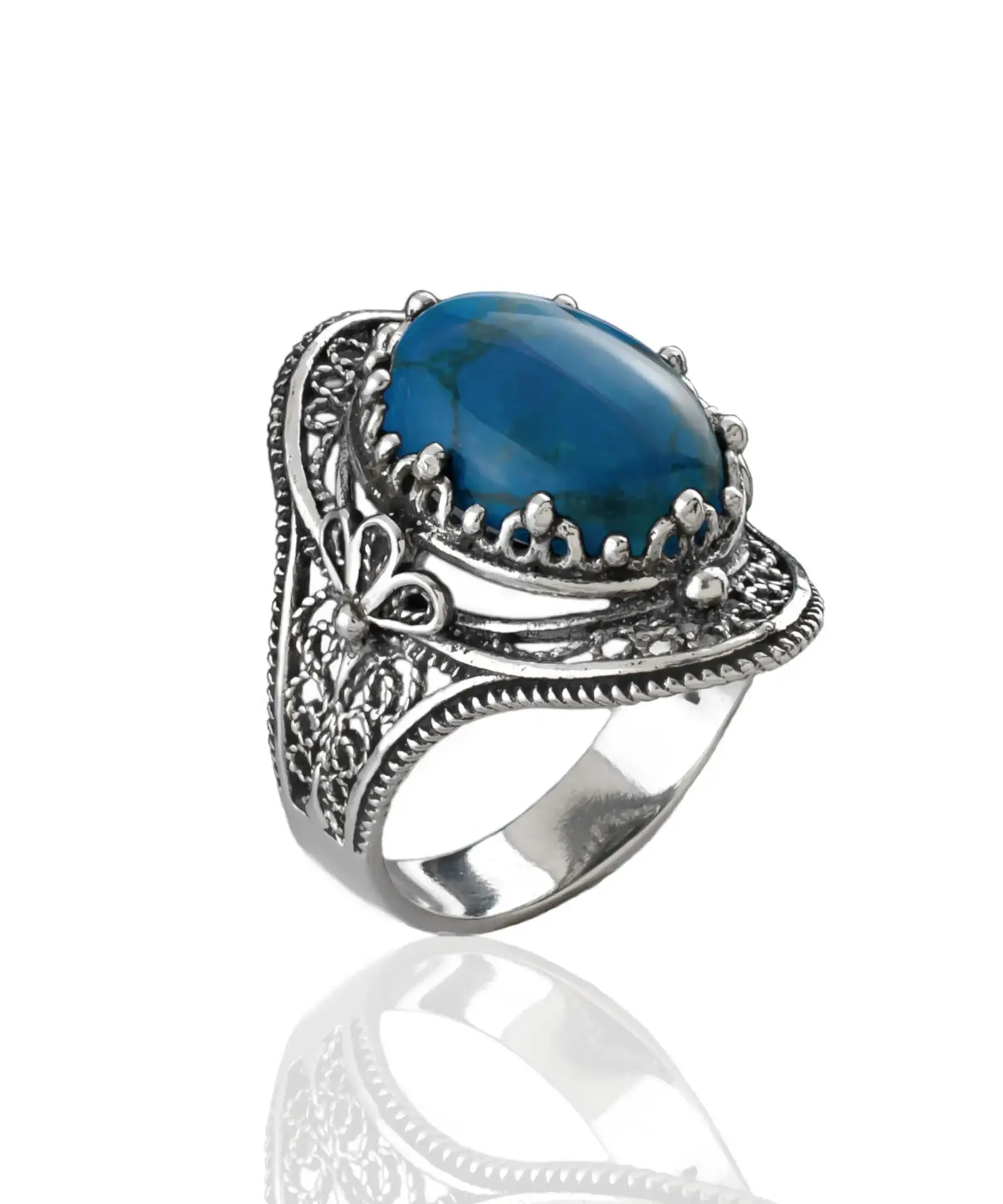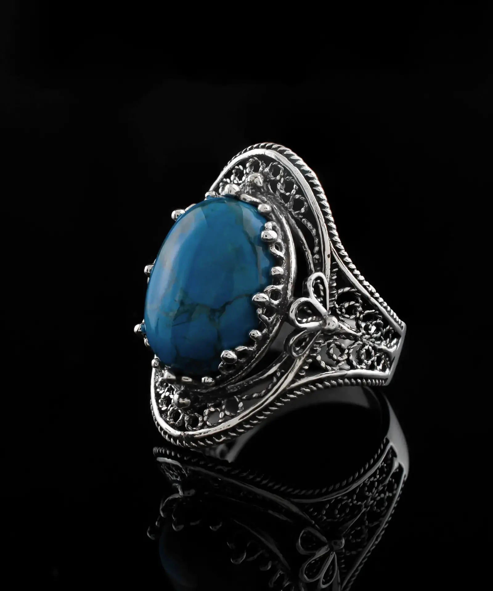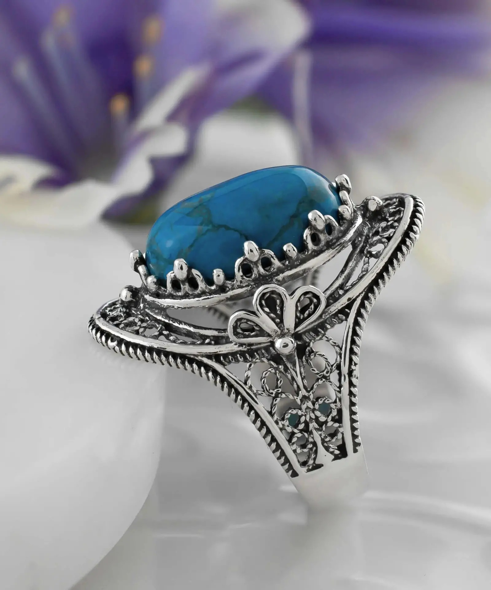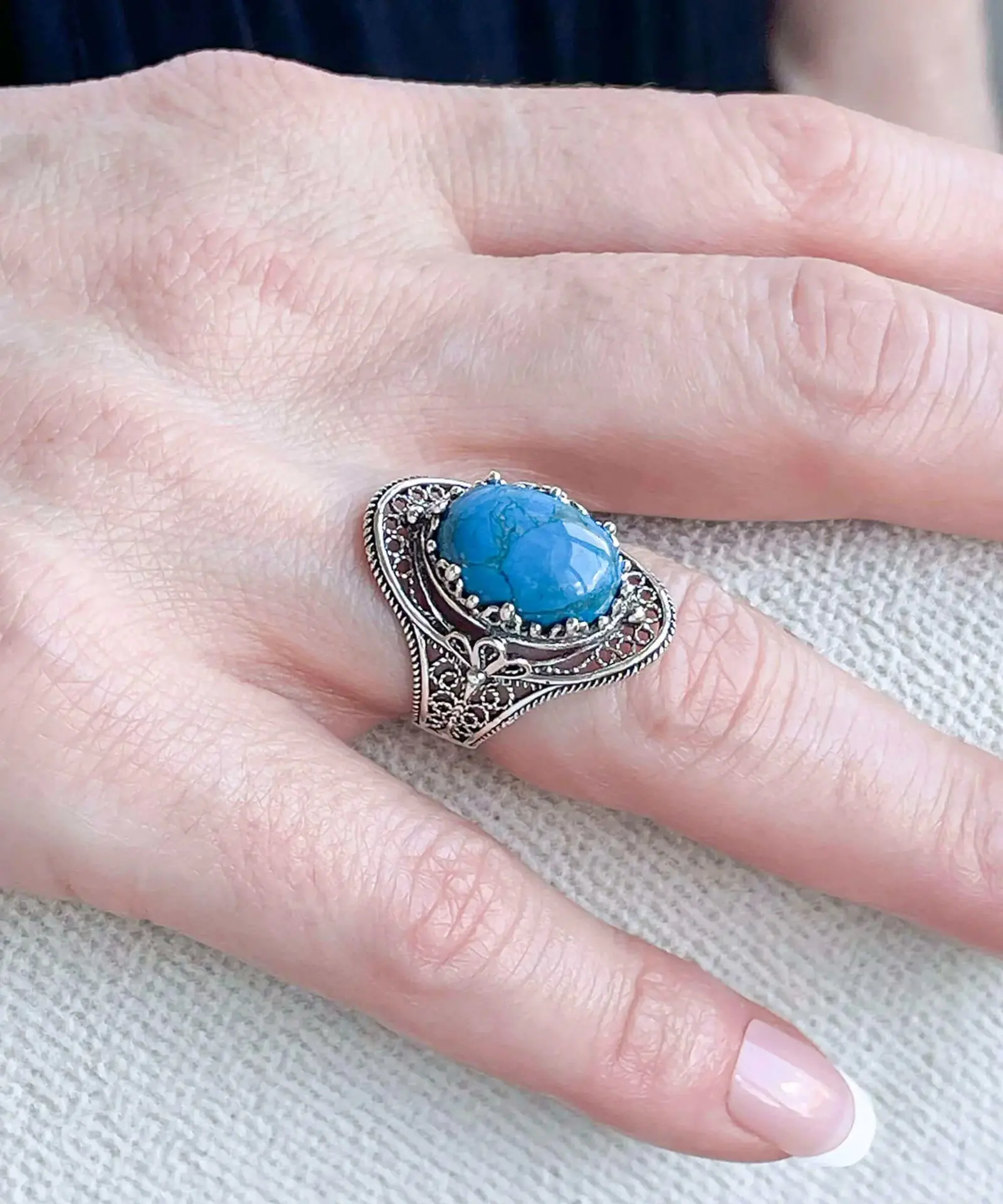 This exquisite ring comes with a gift box, velvet pouch, silver polish cloth, and care card to keep it in pristine condition. The 10x14mm oval cut turquoise gemstone is cabochon, which reflects light beautifully in every direction. Our team of Artisans and Craftsmen designed and handcrafted it just for you.